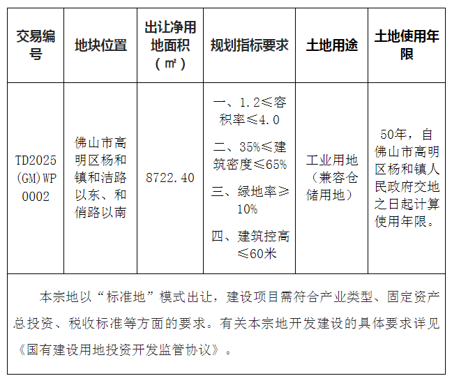 本块地其他规划建设要求按《高明区土地使用规划条件》(佛规明设函〔2025〕0008号)执行。