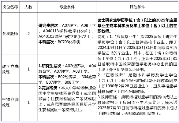面向社会公开招聘硕士研究生学历学位(含)以上的2025年应届毕业生或本科学历及学士学位(含)以上的在职教师,共4人。其中:化学教师2人、数学竞赛教练1人、生物竞赛教练1人。