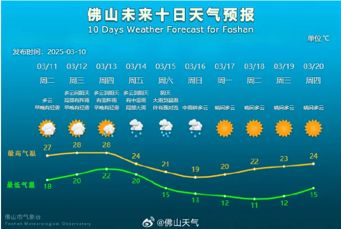 12日夜间-13日 ,一股弱冷空气南下影响,冷暖空气交汇加上南风辐合,切变线给西北部市县带来雷阵雨局部大雨或暴雨,局地伴有8级左右短时大风等强对流天气,其余地区多云为主,有短时(雷)阵雨,早晚有轻雾或雾。
