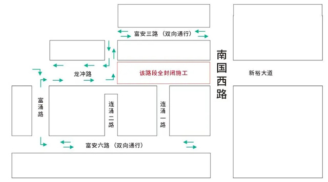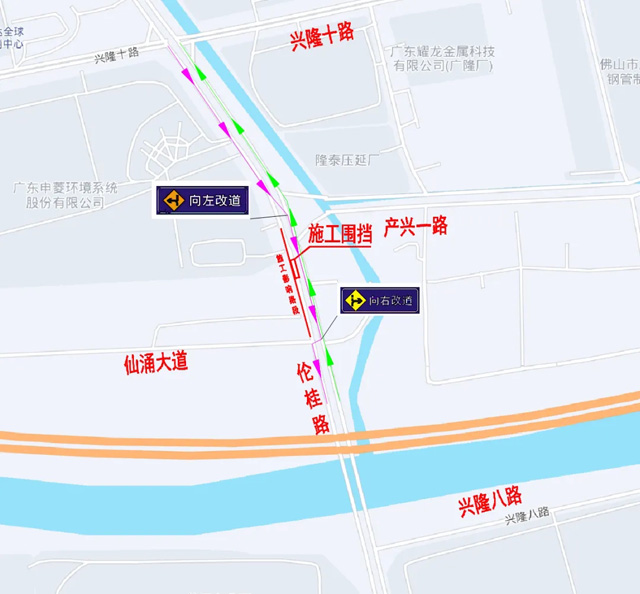 伦桂路(左幅)北向南方向(兴隆十路至仙涌大道段)进行全封闭施工,车辆导流至右幅通行。伦桂路(右侧)南向北方向(仙涌大道至兴隆十路段)调整为双向两车道和人行及非机动车道通行。