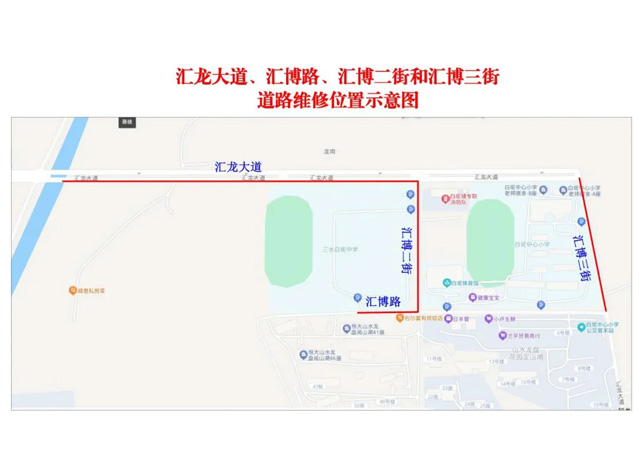即日起至5月4日,三水区白坭镇对汇龙大道、汇博路、汇博二街及汇博三街进行道路维修施工(详见位置示意图)。施工期间,上述道路将临时封闭一条车道,具体安排如下: