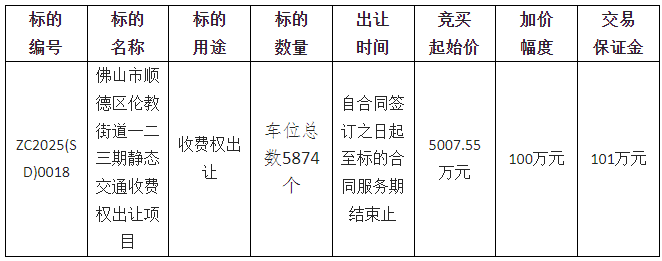 广东城安城市建设管理有限公司(代理机构)受佛山市顺德区伦教街道市政管理处(出让方)委托采用网上竞价方式出让佛山市顺德区伦教街道一二三期静态交通收费权出让项目收益权,欢迎符合资格的竞买人参与竞价。