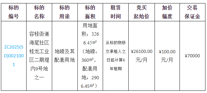 1.项目名称:佛山市顺德区容桂街道海尾社区桂龙工业区二期堤内9号地之一租赁权竞投
