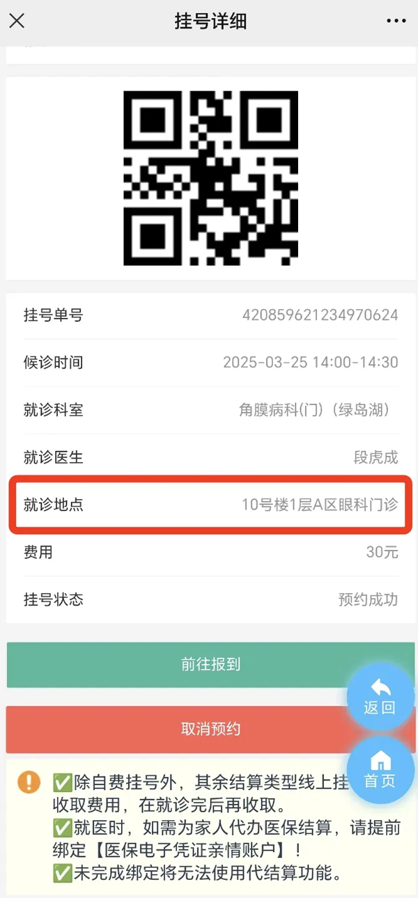 4. 成功挂号后会显示挂号详细,注意“就诊地点”。请根据“就诊地点”显示的地址,在当天按时前往就诊。