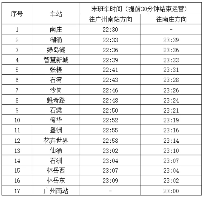 因设备设施检修需要,2号线将于3月25日起提前30分钟结束运营,调整后各站点末班车时间如下图。