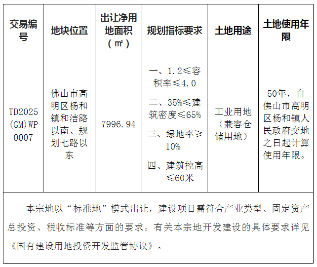 本块地其他规划建设要求按《高明区土地使用规划条件》(佛规明设函〔2025〕0017号)执行。