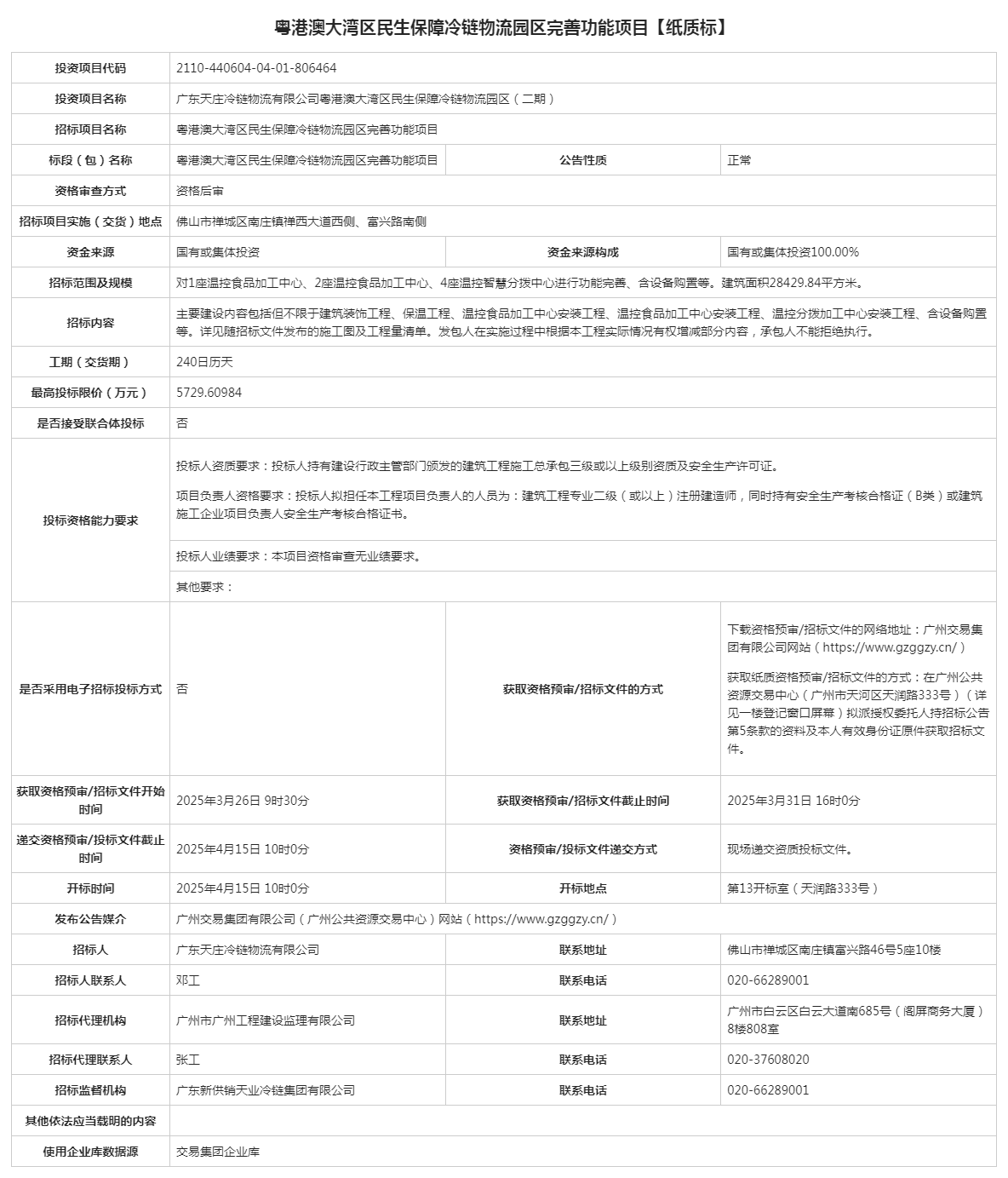 粤港澳大湾区民生保障冷链物流园区完善功能项目招标公告