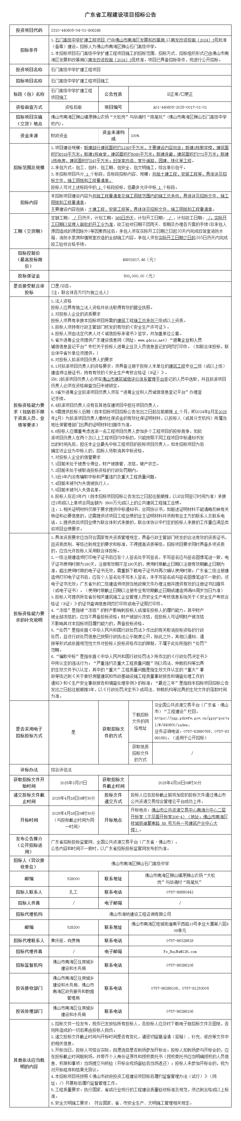 概述:石门高级中学扩建工程项目 已由佛山市南海区发展和改革局 以南发改资投审〔2024〕3号批准(备案)建设。招标人为佛山市南海区狮山石门高级中学......