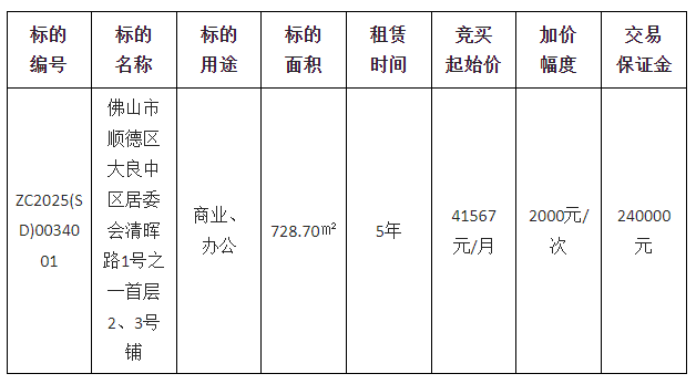 佛山市顺德区盈良物业管理有限公司采用网上竞价方式出租位于佛山市顺德区大良中区居委会清晖路1号之一首层2、3号铺,欢迎符合资格的竞买人参与竞价。
