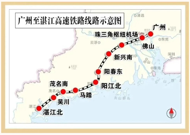 广湛高铁作为“八纵八横”高速铁路网中沿海铁路客运大通道的重要组成部分,线路从广州站出发,途经佛山、肇庆、云浮、阳江、茂名、湛江等城市,终至湛江北站,设计速度350公里/小时。项目建成通车后,将实现广州中心城区到湛江中心城区90分钟互达。