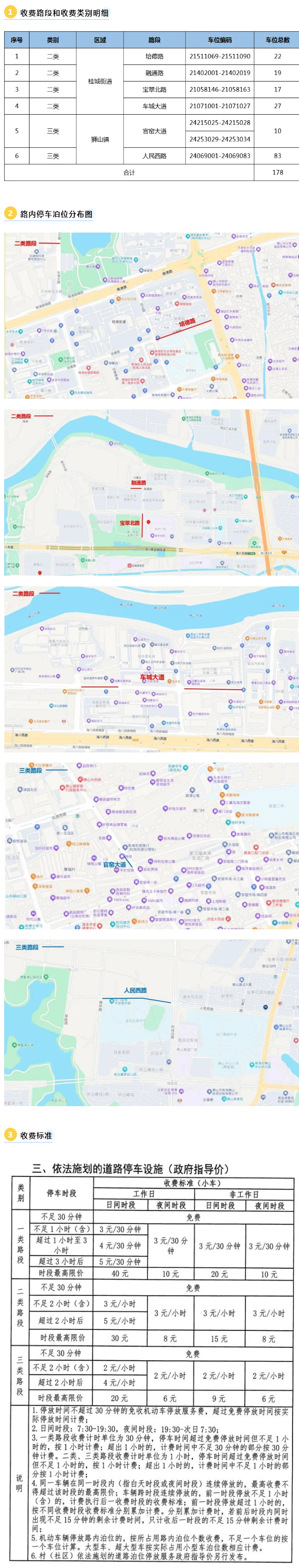 目前,狮山镇官窑大道、狮山城区人民西路以及桂城街道培德路、融通路、宝翠北路、车城大道共计178个停车泊位已完成智能化改造施工建设,于2025年3月25日正式实施收费运营管理。正式运营后的收费类别设置、路段分布图及收费标准详见下文: