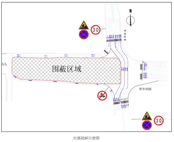 本次施工围蔽占用部分现状禅港西路至南庄码头段季华西路,该路段北侧交改为2车道,南侧交改为1车道。