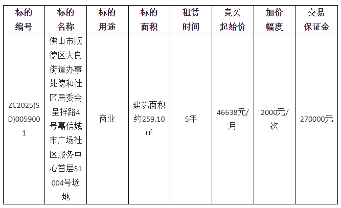 佛山市顺德区盈良物业管理有限公司采用网上竞价方式出租位于佛山市顺德区大良街道办事处德和社区居委会呈祥路4号嘉信城市广场社区服务中心首层S1004号场地,欢迎符合资格的竞买人参与竞价。