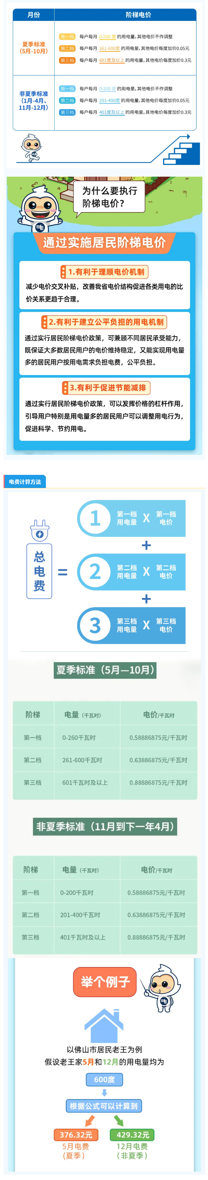 广东城乡居民每月用电量分为三档电价实行分档递增,并将电量分档划分为夏季标准(5月—10月)和非夏季标准(11月—次年4月)。