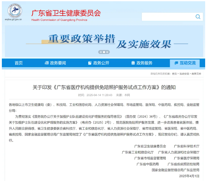 近日,省卫生健康委联合省科技厅、省工业和信息化厅、省人力资源社会保障厅、省市场监管局、省医保局、省中医药局、省疾控局、国家金融监督管理总局广东监管局等9部门共同出台《广东省医疗机构提供免陪照护服务试点工作方案》。