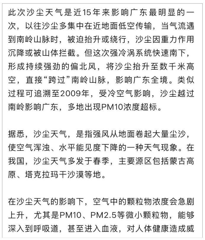 据广东气象部门消息,受强烈的蒙古气旋影响,11日白天,蒙古国和我国内蒙古西部地区出现大范围沙尘暴天气。随着强冷空气南下,沙尘随后一路南下影响我国中东部地区。4月12日,广东强对流自北向南影响结束后,在空中冷空气大风作用下,部分沙尘翻越南岭山脉进入广东。12日傍晚至13日白天,广东大部分市县罕见地出现了扬沙或浮尘天气,最低能见度下降至5-10公里,大气颗粒物PM10的监测浓度明显上升。
