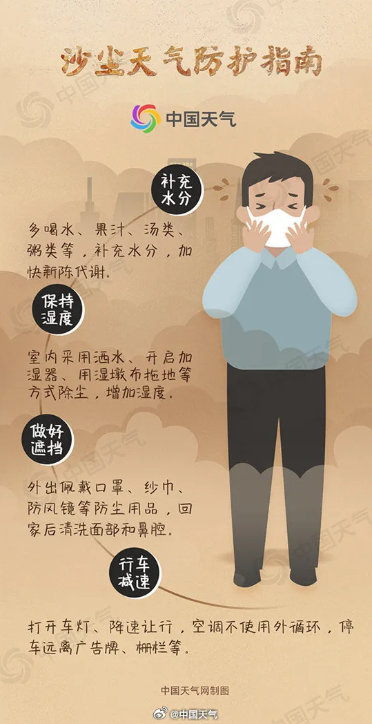 2.外出时要戴好口罩,或围上纱巾等防尘用品,以免沙尘对眼睛和呼吸道造成损伤;