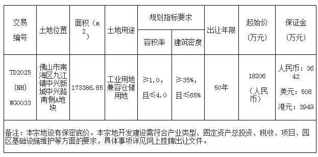 八、自本次公告起至网上挂牌截止期间,如有关于本宗地竞买文件的修改、澄清、说明等将通过网上交易系统以及佛山市南海区人民政府网发布,请有意参与竞买者密切留意。其它未尽事宜,详见本宗地的网上挂牌出让文件。