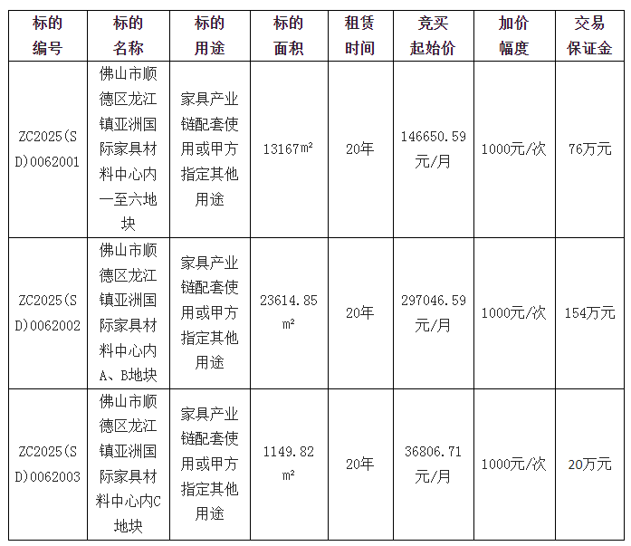 佛山市顺德区龙江镇峰江商贸投资有限公司采用网上竞价方式出租位于佛山市顺德区龙江镇亚洲国际家具材料中心内一至六、A、B、C地块使用权,欢迎符合资格的竞买人参与竞价。