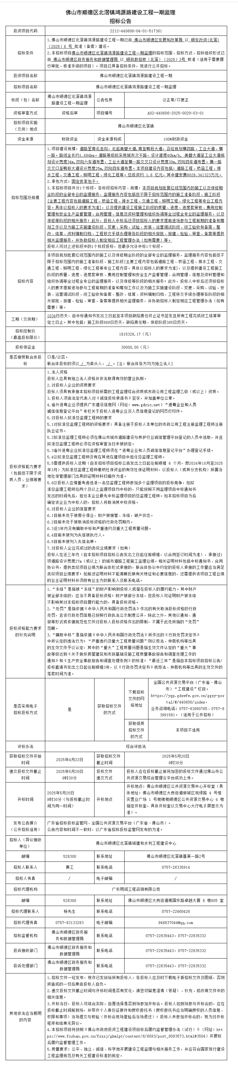 佛山市顺德区北滘镇鸿源路建设工程一期施工招标公告