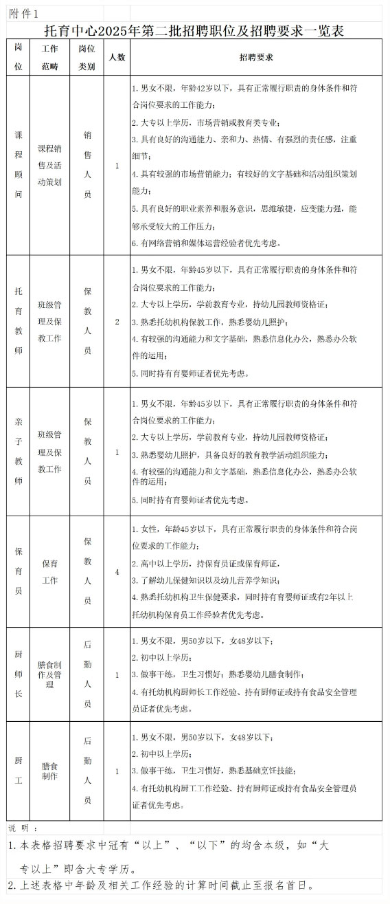 详见《托育中心2025年第二批招聘职位及招聘要求一览表》(附件1)。
