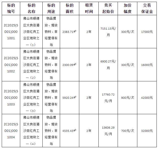 佛山市顺德区大良德良物业管理公司采用网上竞价方式出租位于佛山市顺德区大良街道沙田红岗工业区地块之一(1)等4宗地块,欢迎符合资格的竞买人参与竞价。