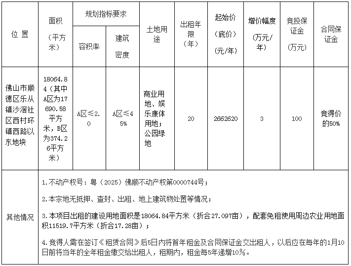 受佛山市顺德区乐从镇人民政府委托,佛山市顺德区公共资源交易中心以网上挂牌方式出租广东省佛山市顺德区乐从镇西村股份合作经济社(以下称“出租人”)的国有建设用地使用权(交易编号为TD2025(SD)WG0013)。现将有关事项公告如下: