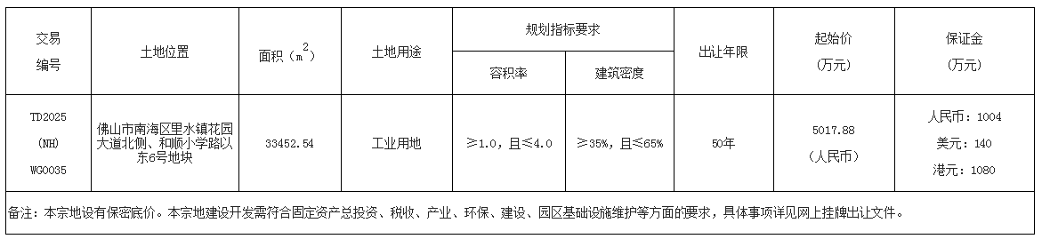 八、自本次公告起至网上挂牌截止期间,如有关于本宗地竞买文件的修改、澄清、说明等将通过网上交易系统以及佛山市南海区人民政府网发布,请有意参与竞买者密切留意。其它未尽事宜,详见本宗地的网上挂牌出让文件。