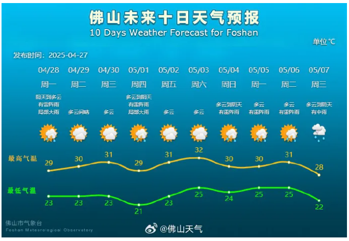 汛期首场暴雨结束,但广东雷雨仍频繁,“五一”假期天气以(雷)阵雨居多。预计今日我市早晨有雷阵雨,并伴有轻雾,雨雾天气路面湿滑,能见度差,请注意交通安全。下午起转多云天气,29-30日以多云天气为主,气温回升。