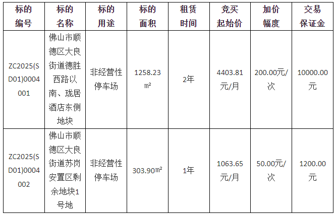 佛山市顺德区盈良物业管理有限公司采用网上竞价方式出租位于佛山市顺德区大良街道德胜西路以南、珑居酒店东侧地块等2宗地块,欢迎符合资格的竞买人参与竞价。