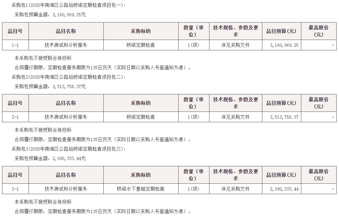 2025年南海区公路站桥梁定期检查项目招标项目的潜在投标人应在广东省政府采购网https://gdgpo.czt.gd.gov.cn/获取招标文件,并于 2025年05月20日 09时00分 (北京时间)前递交投标文件。