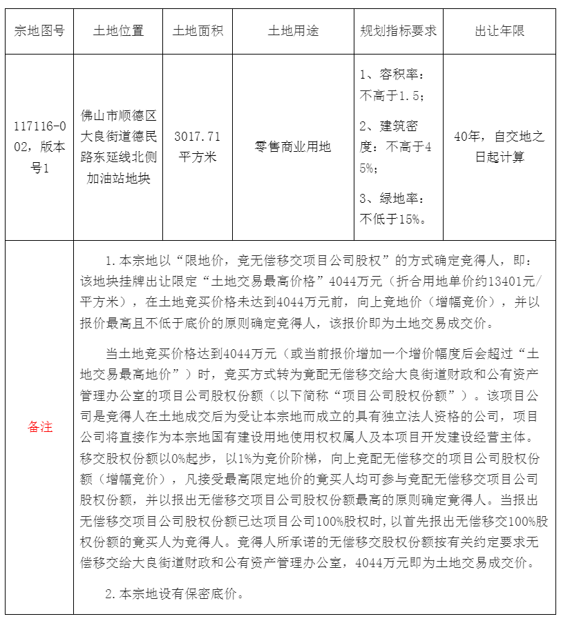 佛山市顺德区大良街道德民路东延线北侧加油站地块挂牌出让