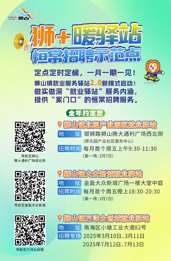 以狮山镇北园产业园区就业驿站、大众新城就业驿站、万洋众创就业驿站为首批试点,狮山全面打通“政府-园区/第三方人力资源机构-企业”之间的供需桥梁,探索“狮+就业驿站2.0”自生造血新模式,定期定点为企业和求职者提供“家门口”恒常招聘服务。