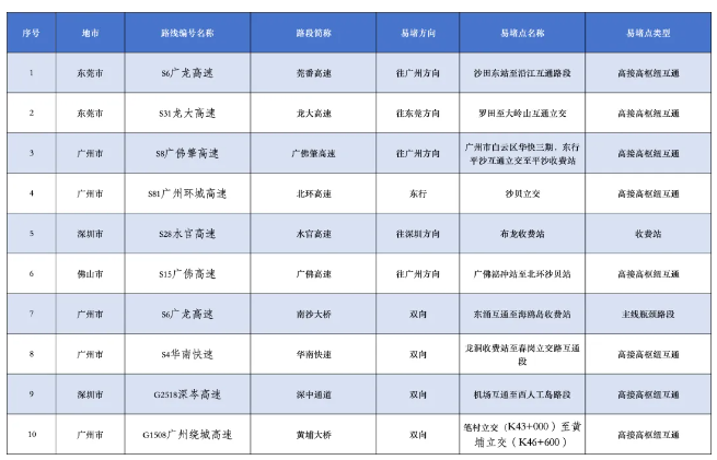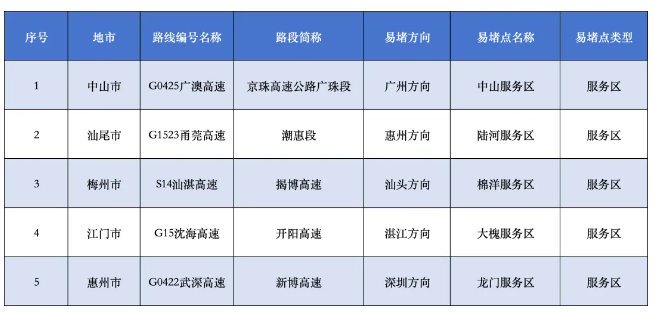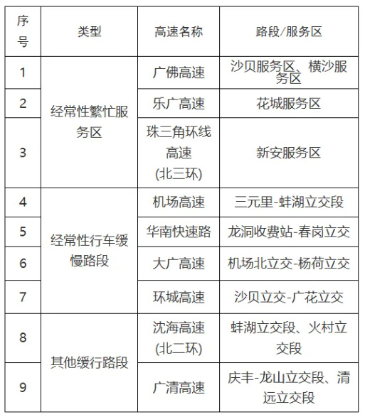 经与广东省交通运输厅联合研判,今年广东省“五一”期间较为拥堵的路段、车流繁忙服务区、充电繁忙服务区有以下几处: