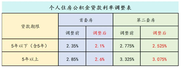 一、下调个人住房公积金贷款利率0.25个百分点。其中,5年以下(含5年)首套个人住房公积金贷款利率由2.35%下调至2.1%,5年以上首套个人住房公积金贷款利率由2.85%下调至2.6%。5年以下(含5年)第二套个人住房公积金贷款利率由2.775%下调至2.525%,5年以上第二套个人住房公积金贷款利率由3.325%下调至3.075%。