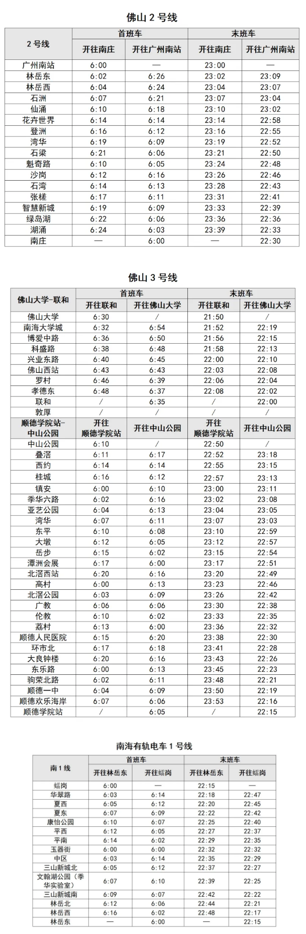 为科学安排运能配置,经对各线路长期客流监测数据、运力利用率等因素综合评估,5月8日起,佛山地铁2号线、3号线及南海有轨电车1号线将实施末班车时间优化调整,各线路末班车发车时间将提前30分钟。调整后,各线路车站末班车时间如下: