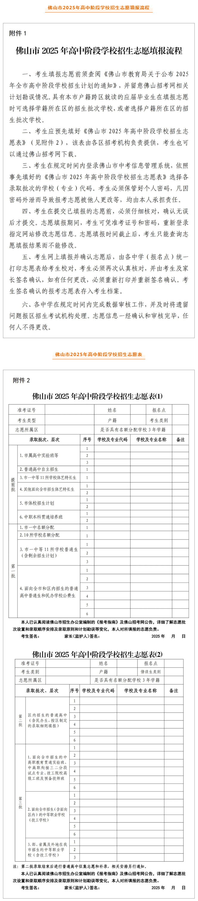 4.公办和民办学校实行属地招生和同步招生,考生志愿必须通过佛山市中考信息管理系统填报,第二批录取结束后,未被录取且达到补录资格要求的考生,可填报征集志愿参加统一补录。