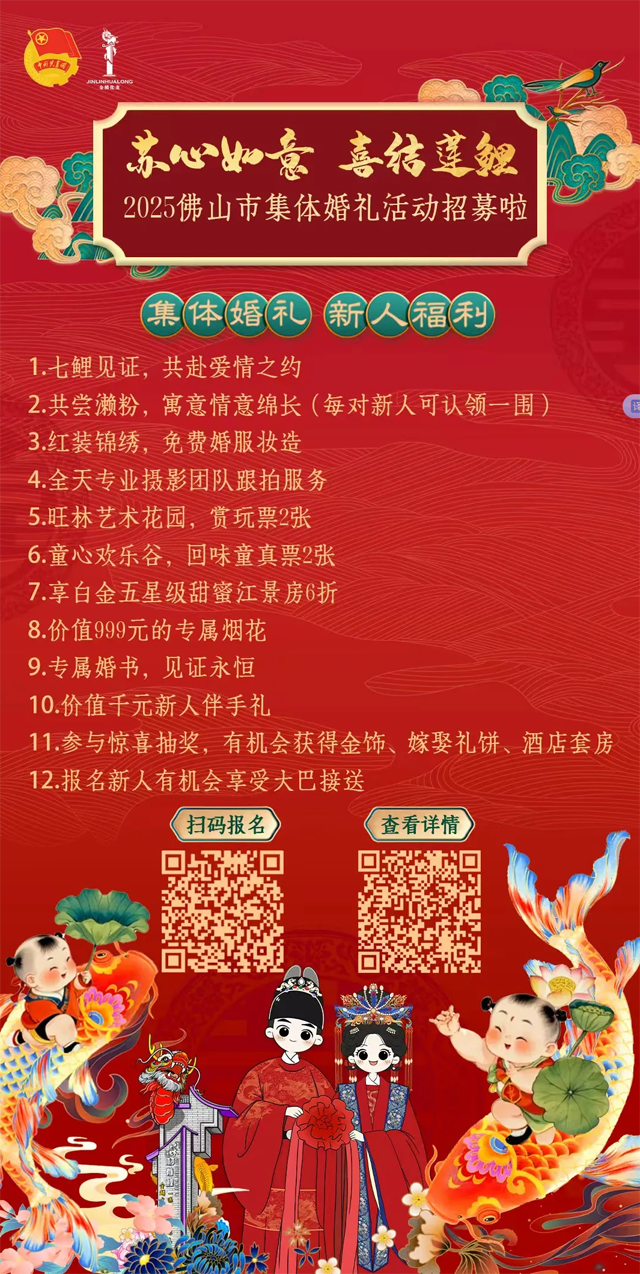 2025佛山集体婚礼是由共青团佛山市委员会主办,佛山市志愿者行动服务中心、共青团佛山市高明区委员会、佛山市高明区荷城街道办事处、佛山市高明区民政局联合承办,在佛山新晋网红打卡地——蘇村锦鲤文化街区隆重举办,并首次推出“苏心如意 喜结莲鲤”品牌,以最地道的“蘇式”婚礼,面向全市开放20对免费名额,提供特色婚服、精致妆造、专业摄影、景点门票、甜蜜江景套房、专属烟花、濑粉宴、新人伴手礼、共植爱情树等系列体验活动,以“蘇心包办”态度,为新人的爱情加冕!