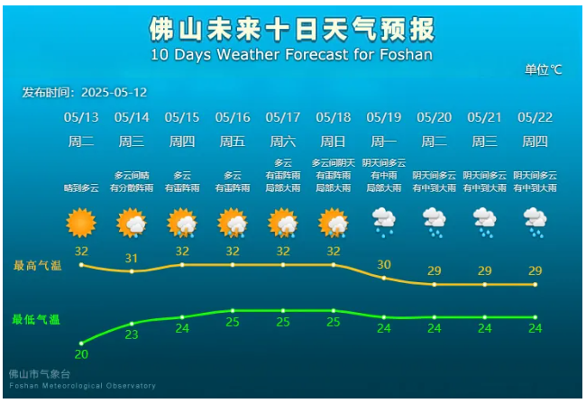 佛山市气象台预计,5月13日佛山天气晴好,昼夜温差较大,早晚清凉,请适时添减衣物,注意防晒;14日起云量增多,有分散雷阵雨。