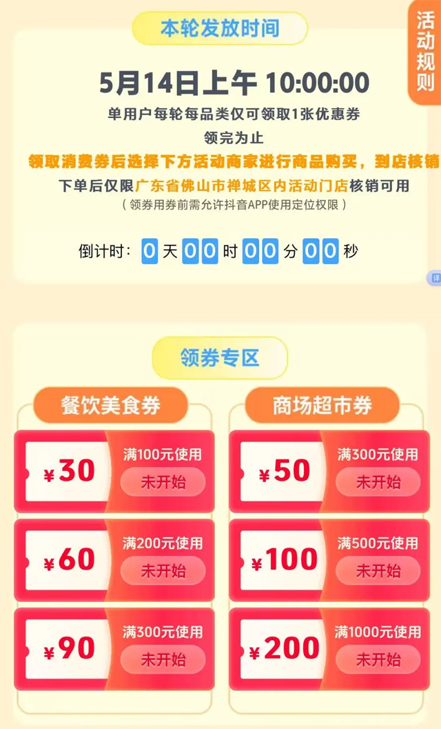 禅城区消费券通过抖音平台多批次发放,可在禅城区内参与活动的商家使用。市民可在抖音APP搜索“禅城消费券”在线领券,并查看可用商家。最新一批消费券将于今日(5月14日)上午10点开抢。
