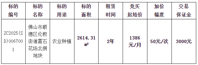 佛山市顺德区顺伦集团有限公司采用网上竞价方式出租位于佛山市顺德区伦教街道霞石花场北侧地块使用权,欢迎符合资格的竞买人参与竞价。