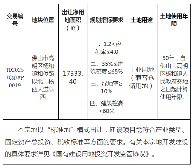 本块地其他规划建设要求按《高明区土地使用规划条件》(佛规明设函〔2025〕0041号)执行。