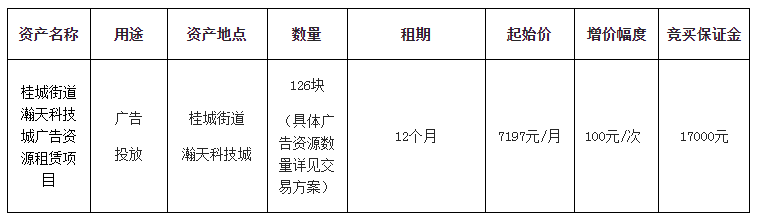 6.竞得人须向招租人提供免费广告合作资源:每月向招租人赠送电子屏一周一面的画面轮播时间,内容只限于瀚天公益广告或政务宣传。(如上级部门有临时的中心工作宣传要求,则双方协商解决)。
