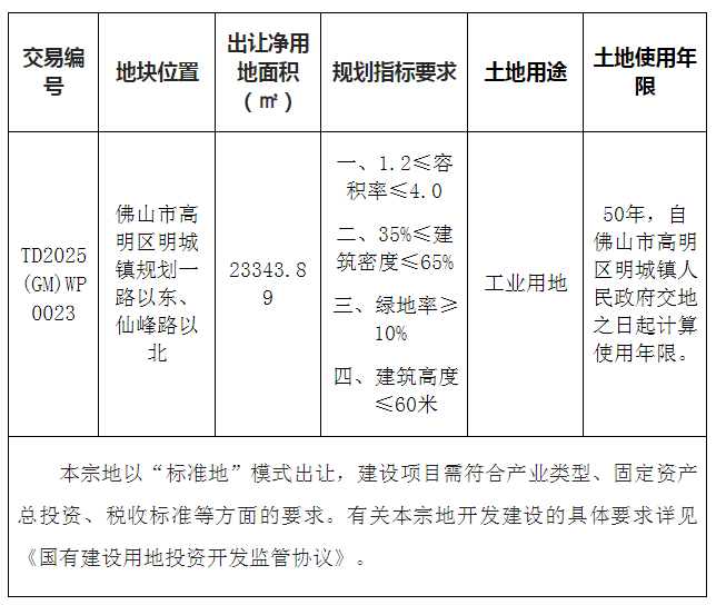 本块地其他规划建设要求按《高明区土地使用规划条件》(佛规明设函〔2025〕0031号)执行。