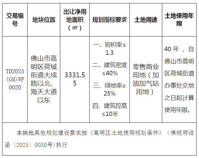 本块地其他规划建设要求按《高明区土地使用规划条件》(佛规明设函〔2025〕0045号)执行。