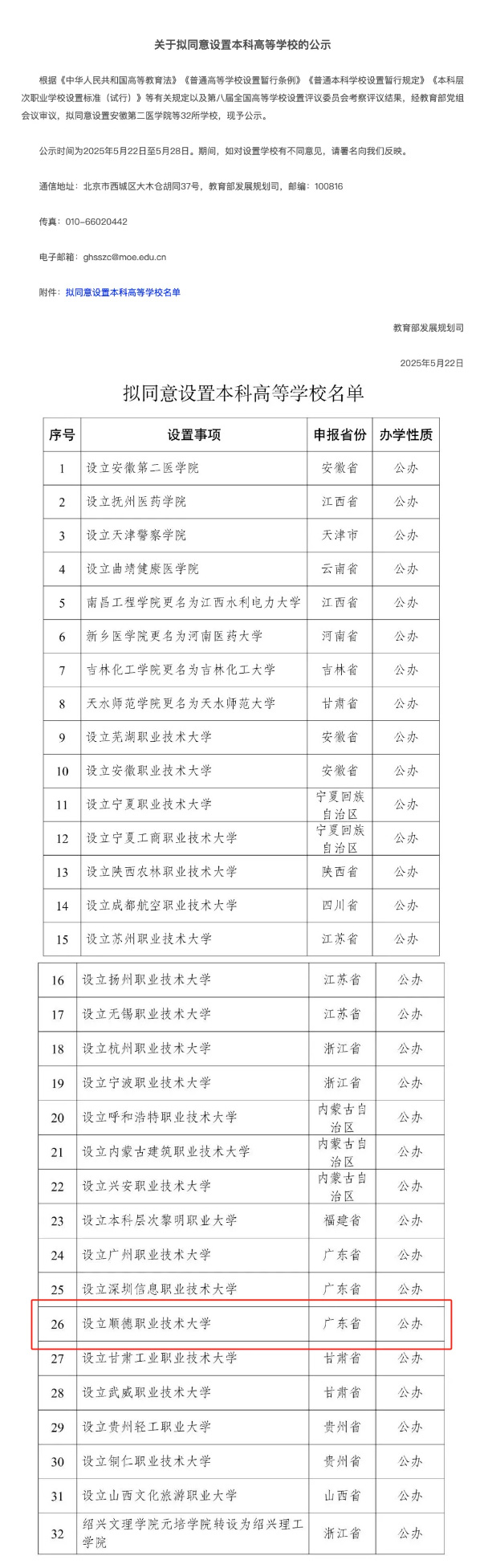 5月22日,教育部发布《关于拟同意设置本科高等学校的公示》,根据《中华人民共和国高等教育法》《普通高等学校设置暂行条例》《普通本科学校设置暂行规定》《本科层次职业学校设置标准(试行)》等有关规定以及第八届全国高等学校设置评议委员会考察评议结果,经教育部党组会议审议,拟同意设置安徽第二医学院等32所学校。公示时间为2025年5月22日至5月28日。