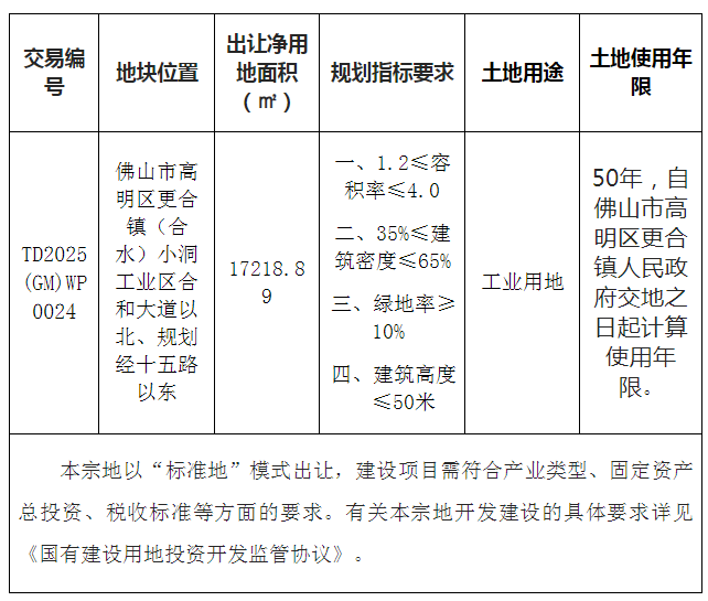 本块地其他规划建设要求按《高明区土地使用规划条件》(佛规明设函〔2025〕0049号)执行。