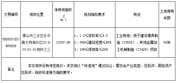 五、有意参与竞买者可于2025年5月26日后登录网上交易系统下载TD2025(SS)WP0028地块的《佛山市三水区国有建设用地使用权网上拍卖出让文件》。
