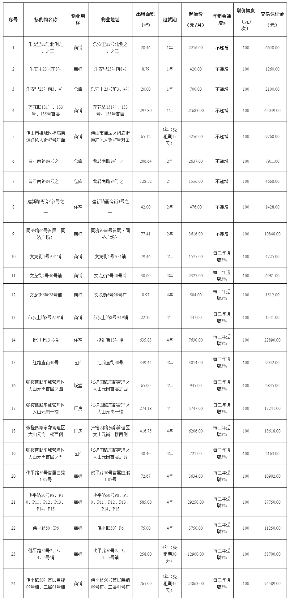 8.优先承租权情况:序号1原租户王国良、序号2原租户越泰(广东)环境技术有限公司佛山分公司、序号3原租户王国良、序号4原租户佛山市三水飞达传媒广告有限公司、序号7原租户佛山市鑫荣管理咨询有限公司、序号9原租户佛山市禅城区少红私房菜馆、序号10原租户陈铭根、序号11原租户方子羡、序号12原租户姜树平、序号13原租户林美珍、序号14原租户蔡斌,序号15原租户刘敦龙、序号16-19原租户佛山市劲创磁电设备有限公司、序号20原租户叶燕燕、序号21、22原租户周磊均享有优先承租权。