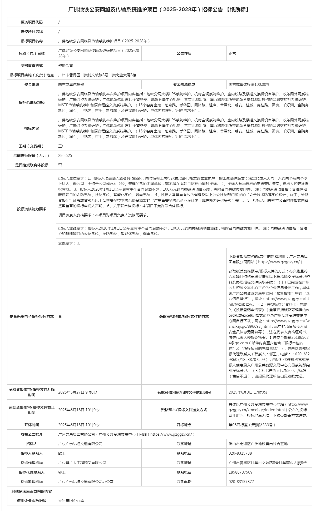 广佛地铁公安网络及传输系统维护项目(2025-2028年)招标公告